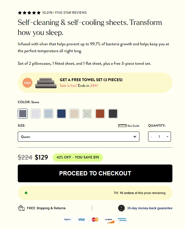 The makers of the sheets offer their users multiple payment options. You can make payments through MasterCard, Visa, Amex Card, and Discover Card. In addition, the company accepts payment through Shop Pay, PayPal, Amazon Pay, and Klarna. Furthermore, the company also offers an express checkout option that enables users to make instant payments through Shop Pay, Amazon pay, PayPal, or G Pay.